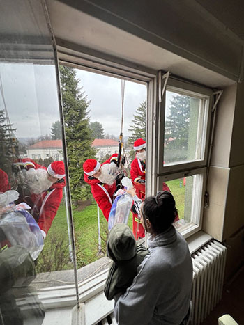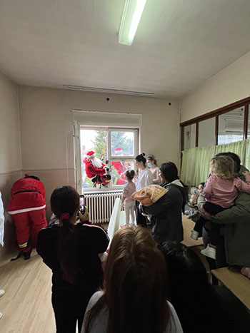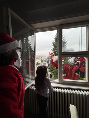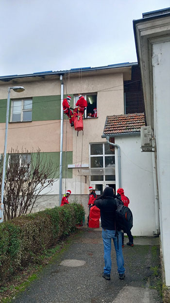 Pripadnici Gorske službe spasavanja, obučeni u kostime Deda Mraza, sa krova zgrade Dečjeg odeljenja spuštali su se i kroz prozor delili novogodišnje paketiće, što je izazvalo oduševljenje i osmehe kod mališana, kao i prazničnu radost kod njihovih roditelja.